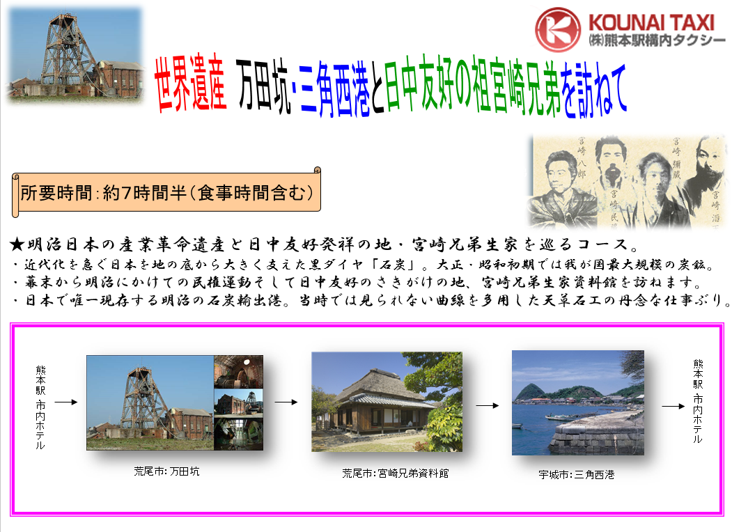 | 世界遺産、万田抗・三角西港と日中友好の祖宮崎兄弟を訪ねて | 7.5時間 |