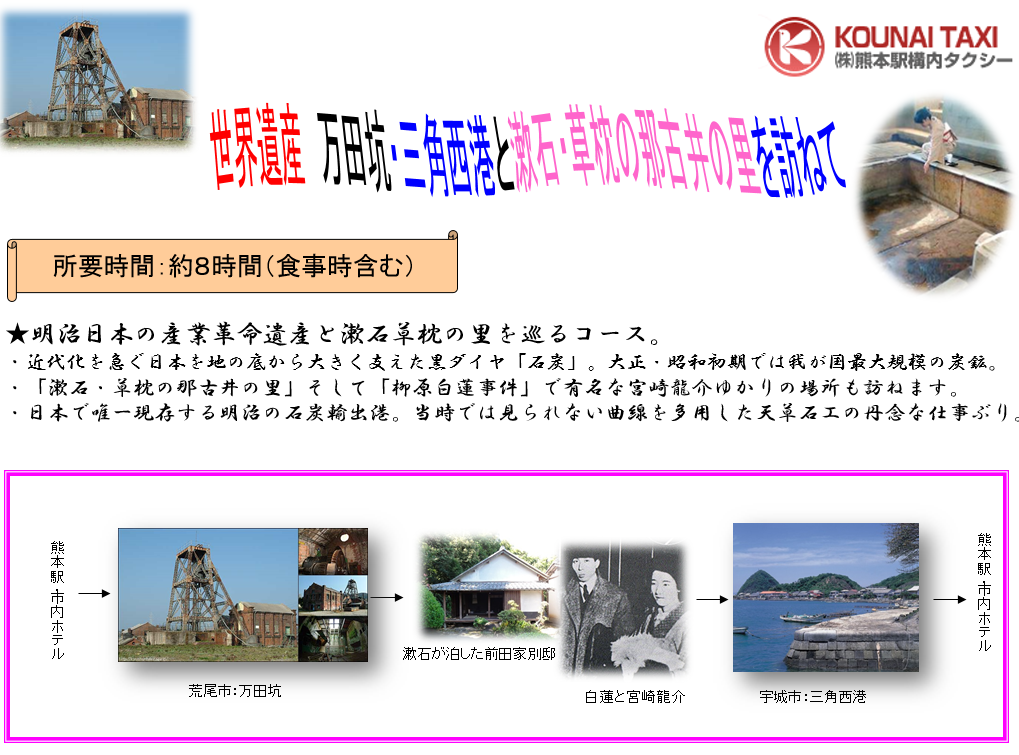 | 世界遺産、万田抗・三角西港と漱石草枕の那古井の里を訪ねて | 8時間 |